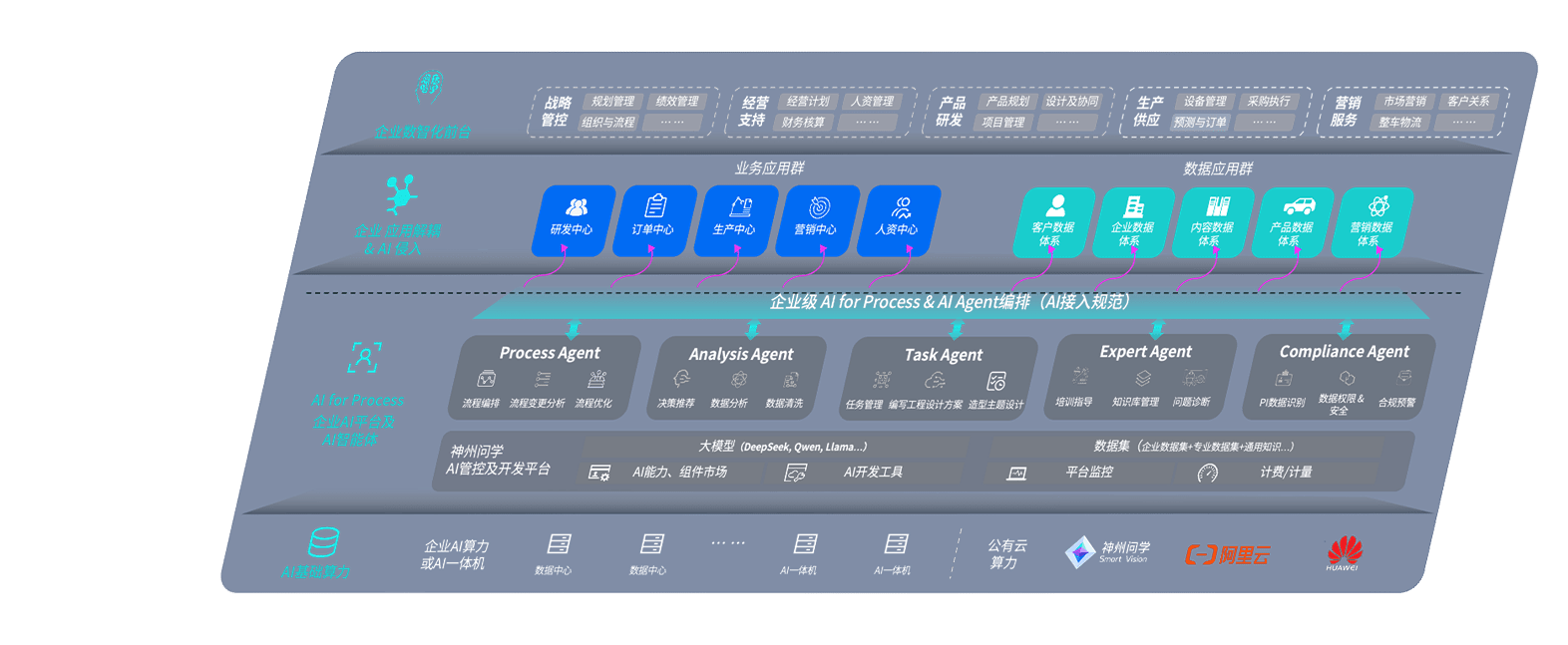 端到端的一站式AI工作空间深度融合了从企业战略规划到日常经营的全流程业务板块,,,定向解决车企内部领域多、、部门多、、、链条长、、场景碎片化等难题,,,支持车企快速构建以AI为核心的生产力写作体系,,,,实现任务执行与AI能力的无缝集成与交互