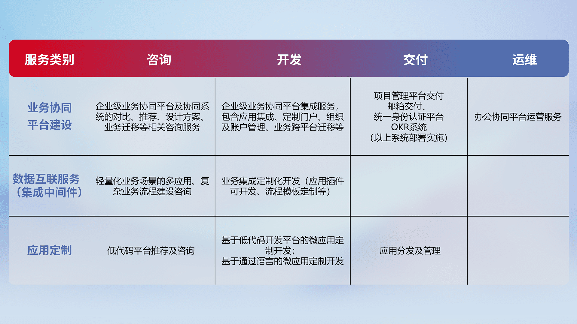针对钉钉、、、、企微、、、、IDaas等平台级产品提供产品的规划、、方案、、、交付、、、、定制化开发等服务,,,,实现如统一协同办公、、、、智能客户服务、、、混合会议管理、、、智能数据查询、、、、等业务场景,,实现数字化转型。。。。