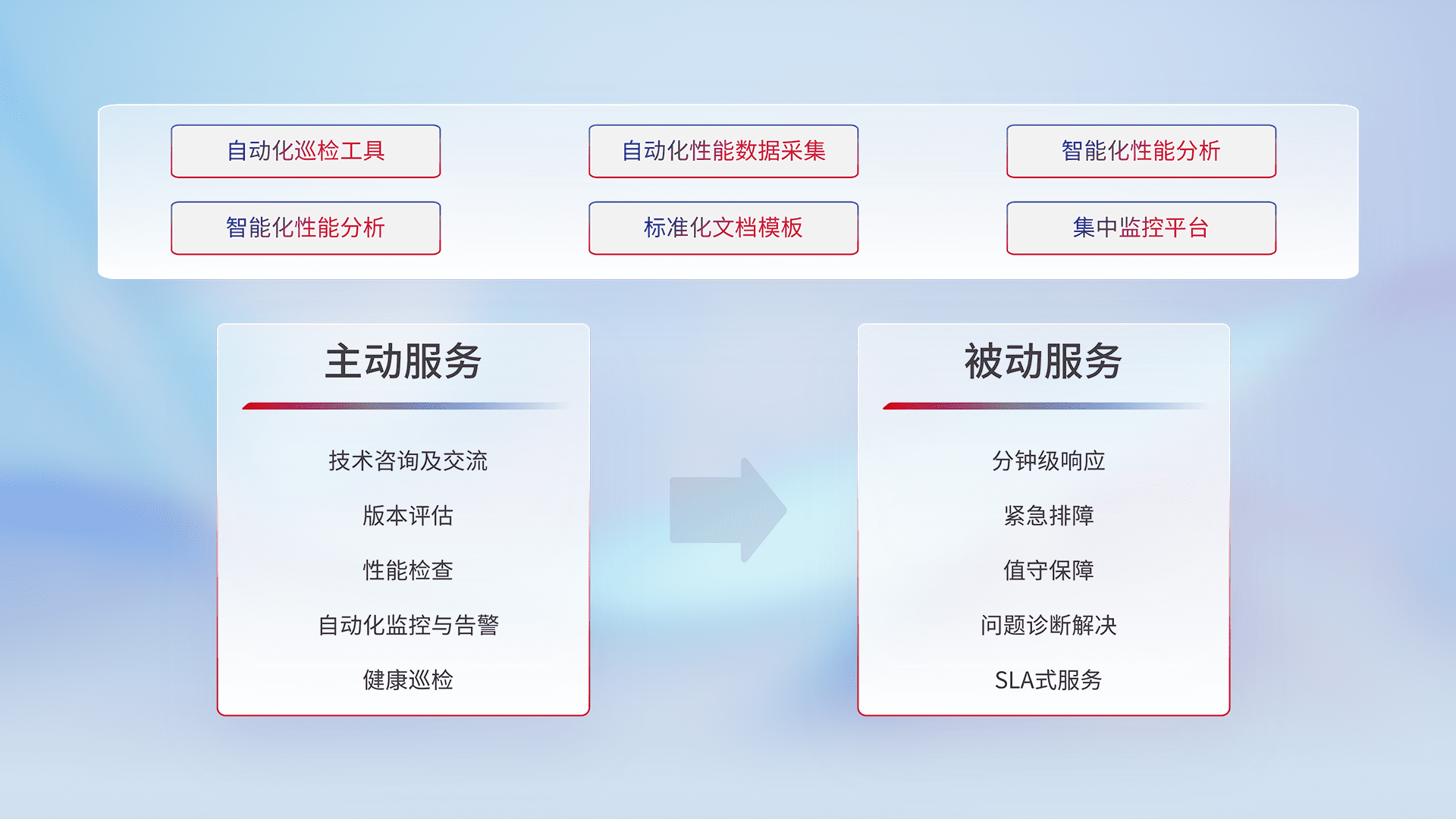 智能化工具和标准化文档,,,保障服务质量,,提供主动服务(包含技术咨询、、、版本评估、、性能检查、、、、自动化监控与告警、、、健康巡检)和被动服务包含(分钟级响应、、、、紧急排障、、值守保障、、问题诊断解决、、SLA服务)。。。。